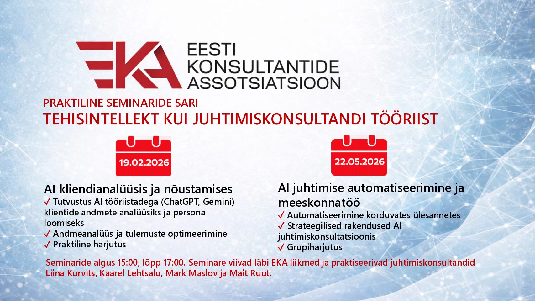 Veebruar 19 @ 15:00 - 17:00 UTC+3 Praktilised veebiseminarid juhtimiskonsultantidele Kutse AI seminarile 👉 Registreeru veebiseminaridele siin